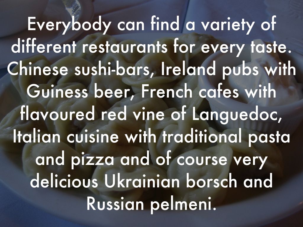 Everybody can find a variety of different restaurants for every taste. Chinese sushi-bars, Ireland pubs with Guiness beer, French cafes with flavoured red vine of Languedoc, Italian cuisine with traditional pasta and pizza and of course very delicious Ukrainian borsch and Russian pelmeni.
