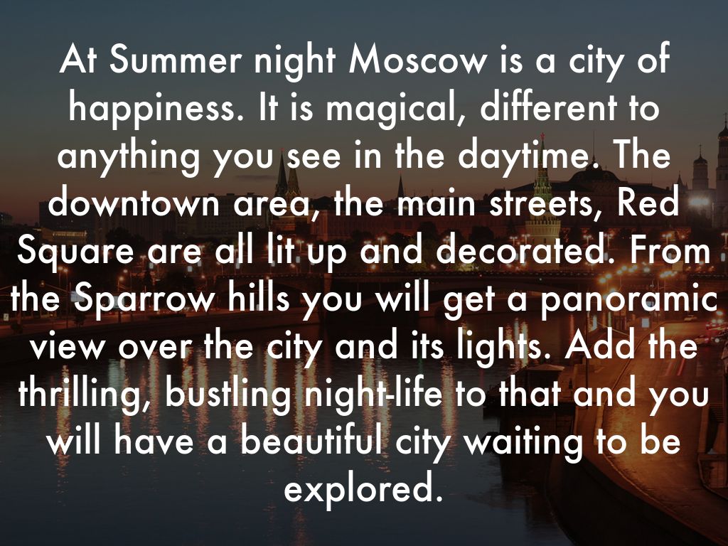 At Summer night Moscow is a city of happiness. It is magical, different to anything you see in the daytime. The downtown area, the main streets, Red Square are all lit up and decorated. From the Sparrow hills you will get a panoramic view over the city and its lights. Add the thrilling, bustling night-life to that and you will have a beautiful city waiting to be explored.