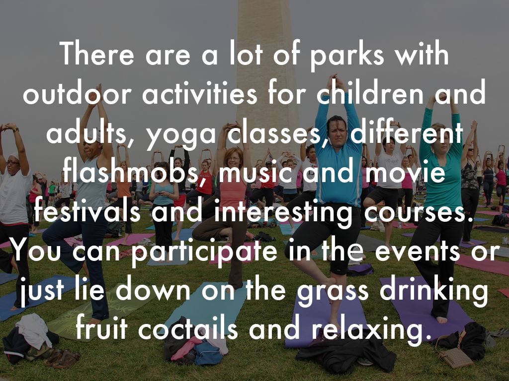 There are a lot of parks with outdoor activities for children and adults, yoga classes, different flashmobs, music and movie festivals and interesting courses. You can participate in thе events or just lie down on the grass drinking fruit coctails and relaxing.