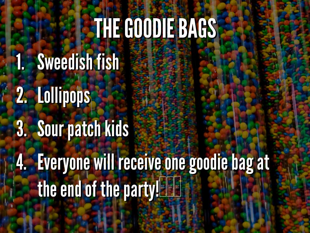 • Everyone will receive one goodie bag at the end of the party!🍭🍫🍑