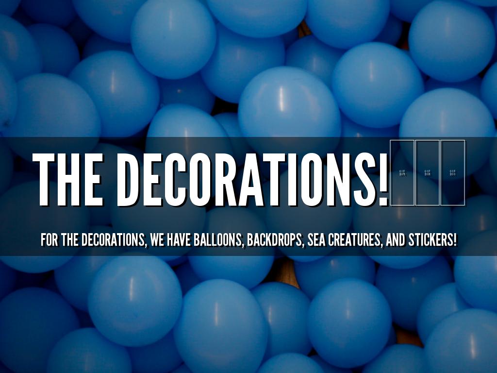 FOR THE DECORATIONS, WE HAVE BALLOONS, BACKDROPS, SEA CREATURES, AND STICKERS!