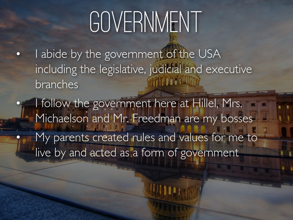 I follow the government here at Hillel, Mrs. Michaelson and Mr. Freedman are my bosses