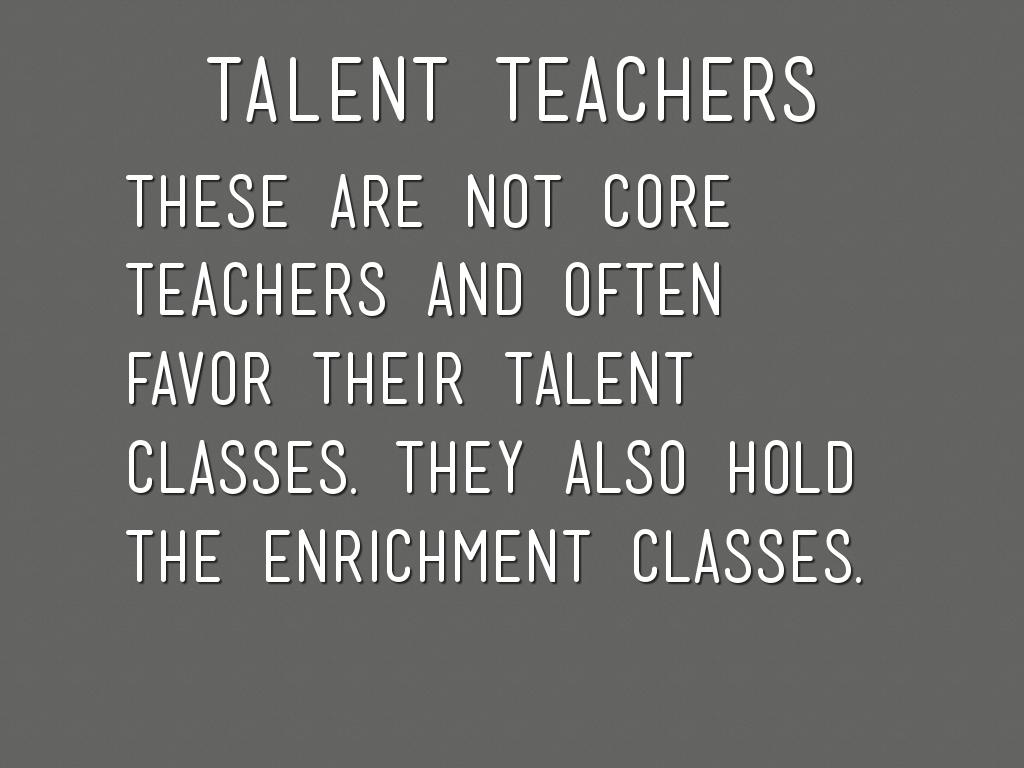 These are not core teachers and often favor their talent classes. They also hold the enrichment classes.