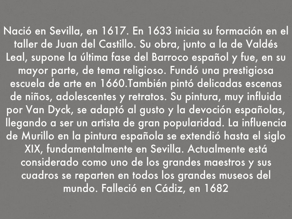 Nació en Sevilla, en 1617. En 1633 inicia su formación en el taller de Juan del Castillo. Su obra, junto a la de Valdés Leal, supone la última fase del Barroco español y fue, en su mayor parte, de tema religioso. Fundó una prestigiosa escuela de arte en 1660.También pintó delicadas escenas de niños, adolescentes y retratos. Su pintura, muy influida por Van Dyck, se adaptó al gusto y la devoción españolas, llegando a ser un artista de gran popularidad. La influencia de Murillo en la pintura española se extendió hasta el siglo XIX, fundamentalmente en Sevilla. Actualmente está considerado como uno de los grandes maestros y sus cuadros se reparten en todos los grandes museos del mundo. Falleció en Cádiz, en 1682