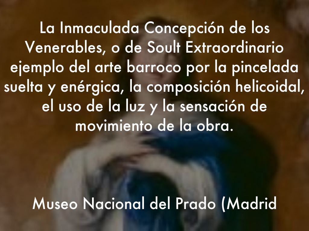 La Inmaculada Concepción de los Venerables, o de Soult Extraordinario ejemplo del arte barroco por la pincelada suelta y enérgica, la composición helicoidal, el uso de la luz y la sensación de movimiento de la obra.