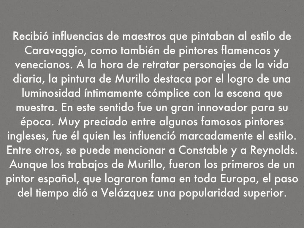Recibió influencias de maestros que pintaban al estilo de Caravaggio, como también de pintores flamencos y venecianos. A la hora de retratar personajes de la vida diaria, la pintura de Murillo destaca por el logro de una luminosidad íntimamente cómplice con la escena que muestra. En este sentido fue un gran innovador para su época. Muy preciado entre algunos famosos pintores ingleses, fue él quien les influenció marcadamente el estilo. Entre otros, se puede mencionar a Constable y a Reynolds. Aunque los trabajos de Murillo, fueron los primeros de un pintor español, que lograron fama en toda Europa, el paso del tiempo dió a Velázquez una popularidad superior.