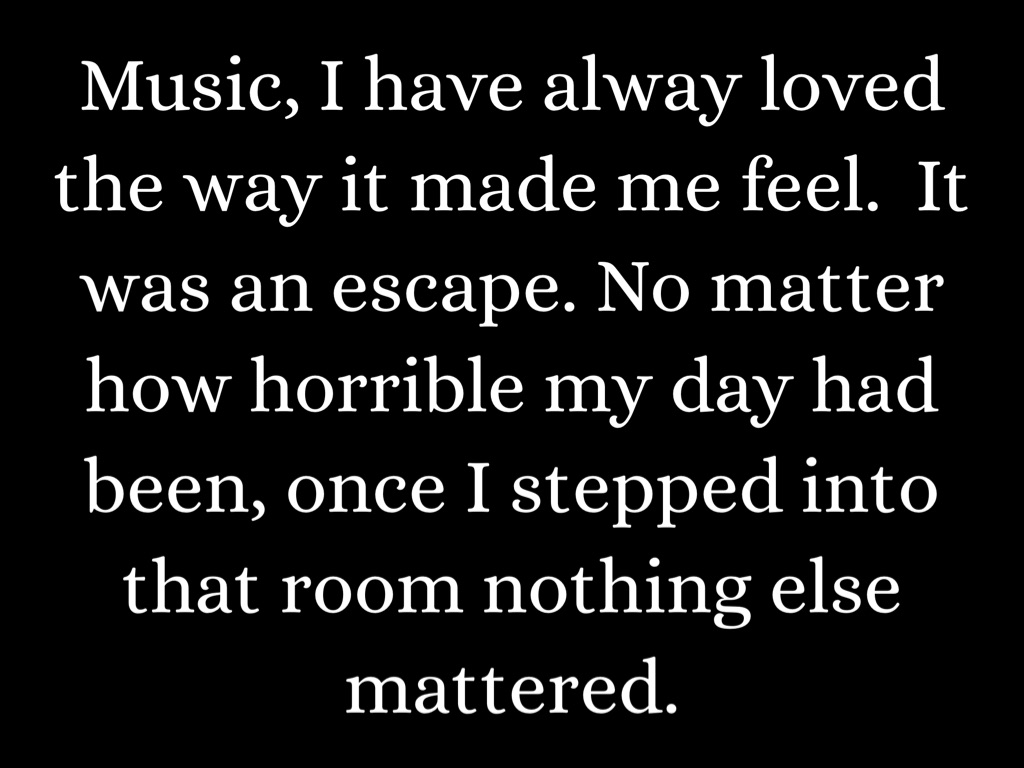 Music, I have alway loved the way it made me feel. It was an escape. No matter how horrible my day had been, once I stepped into that room nothing else mattered.
