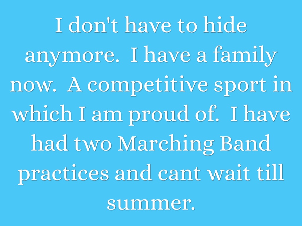 I don't have to hide anymore. I have a family now. A competitive sport in which I am proud of. I have had two Marching Band practices and cant wait till summer.