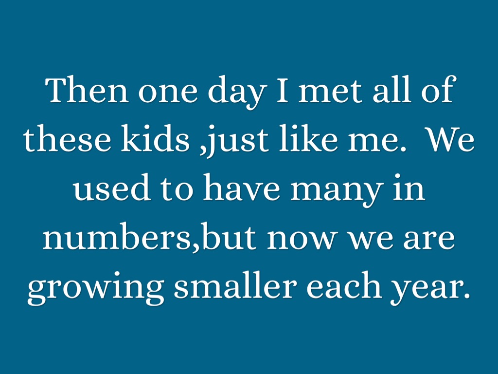 Then one day I met all of these kids ,just like me. We used to have many in numbers,but now we are growing smaller each year.