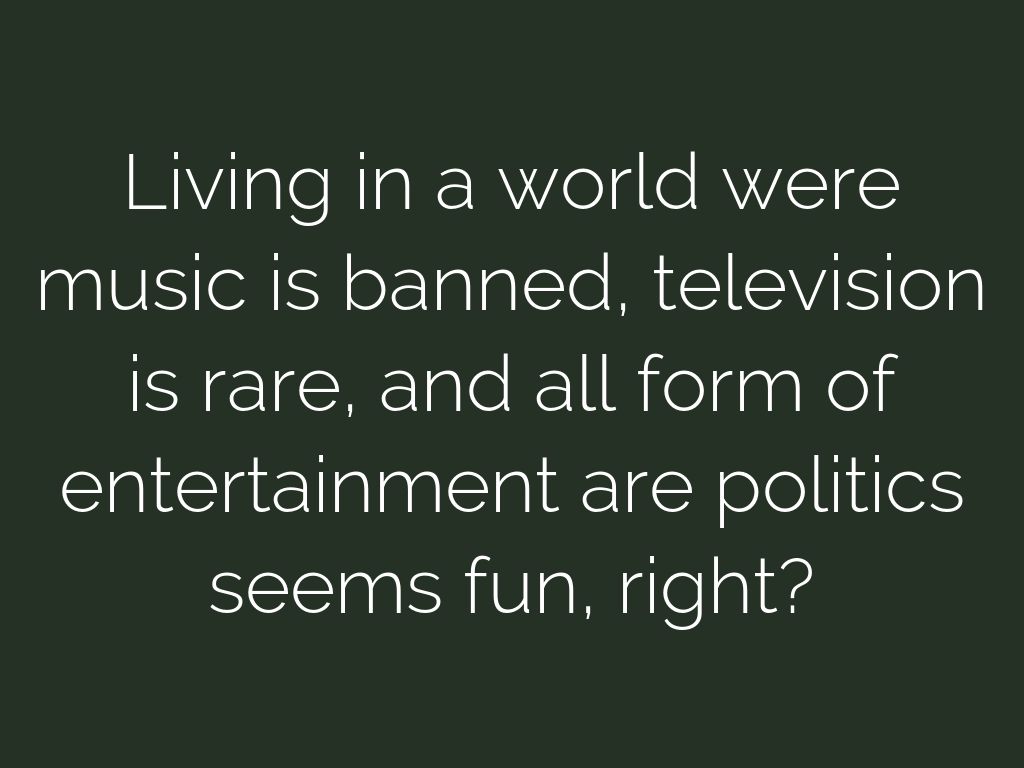 Living in a world were music is banned, television is rare, and all form of entertainment are politics seems fun, right?