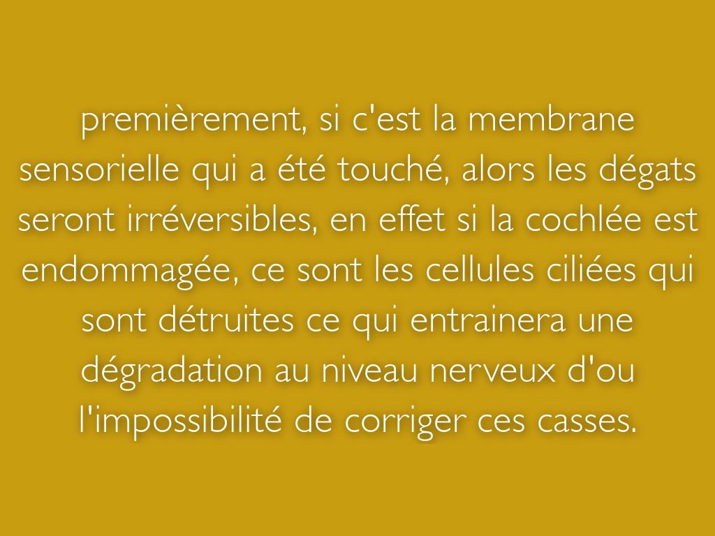 premièrement, si c'est la membrane sensorielle qui a été touché, alors les dégats seront irréversibles, en effet si la cochlée est endommagée, ce sont les cellules ciliées qui sont détruites ce qui entrainera une dégradation au niveau nerveux d'ou l'impossibilité de corriger ces casses.