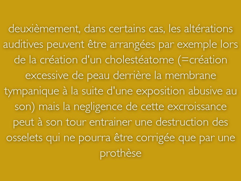 deuxièmement, dans certains cas, les altérations auditives peuvent être arrangées par exemple lors de la création d'un cholestéatome (=création excessive de peau derrière la membrane tympanique à la suite d'une exposition abusive au son) mais la negligence de cette excroissance peut à son tour entrainer une destruction des osselets qui ne pourra être corrigée que par une prothèse