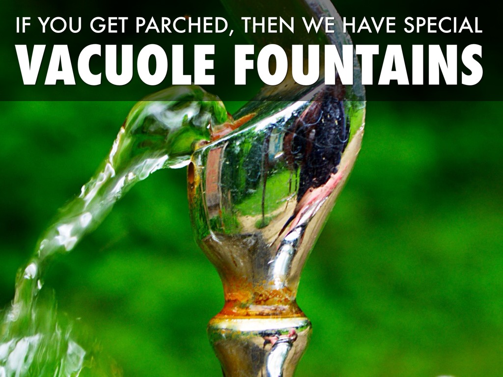 The job of the vacuole is to give the cell the water it needs to survive. Plant cells have larger vacuoles than animal cells because plant cells are ateratrophs which means they feed off of sunlight, and energy they create when going through photosynthesis. and they need more water to live. Water fountains are like vacuoles because they provide water to the people who are touring and who are thirsty.