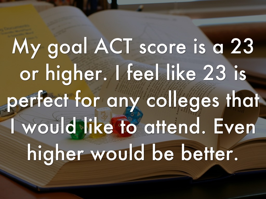 My goal ACT score is a 23 or higher. I feel like 23 is perfect for any colleges that I would like to attend. Even higher would be better.