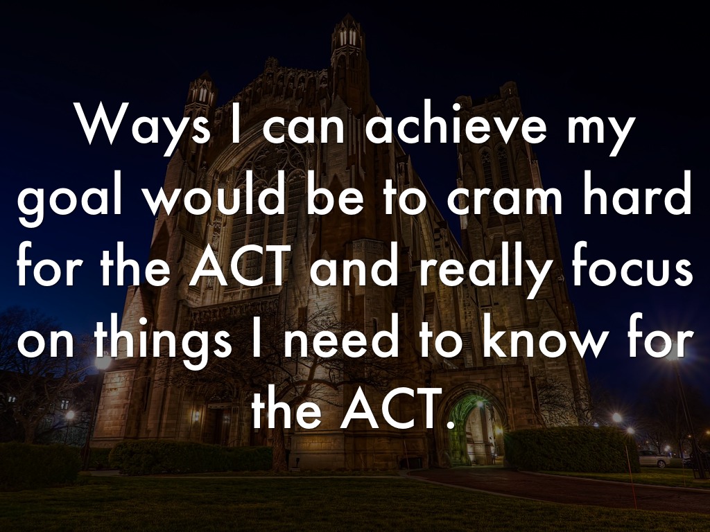 Ways I can achieve my goal would be to cram hard for the ACT and really focus on things I need to know for the ACT.