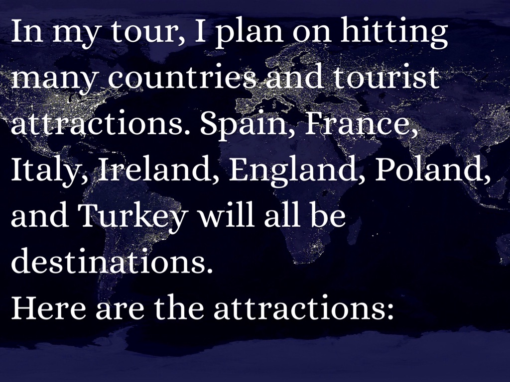 In my tour, I plan on hitting many countries and tourist attractions. Spain, France, Italy, Ireland, England, Poland, and Turkey will all be destinations.