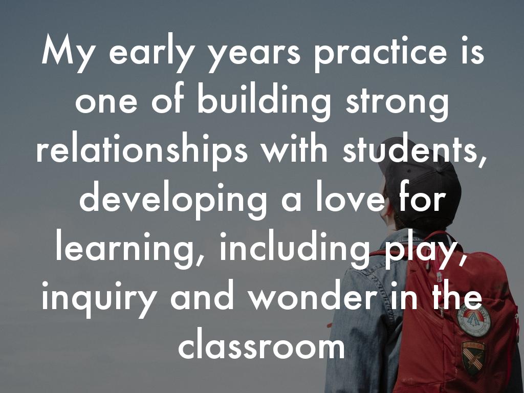 My early years practice is one of building strong relationships with students, developing a love for learning, including play, inquiry and wonder in the classroom