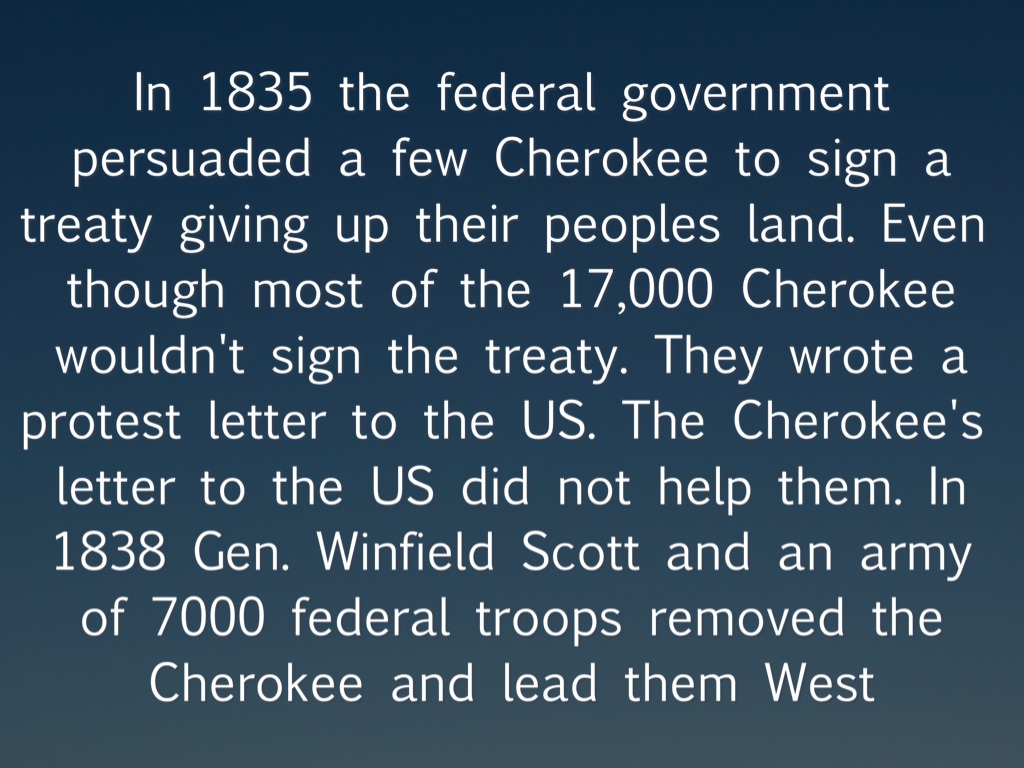 In 1835 the federal government persuaded a few Cherokee to sign a treaty giving up their peoples land. Even though most of the 17,000 Cherokee wouldn't sign the treaty. They wrote a protest letter to the US. The Cherokee's letter to the US did not help them. In 1838 Gen. Winfield Scott and an army of 7000 federal troops removed the Cherokee and lead them West