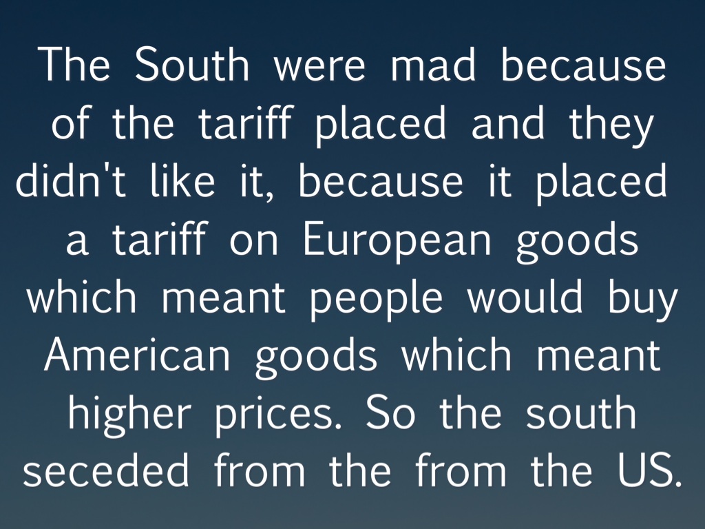 The South were mad because of the tariff placed and they didn't like it, because it placed a tariff on European goods which meant people would buy American goods which meant higher prices. So the south seceded from the from the US.