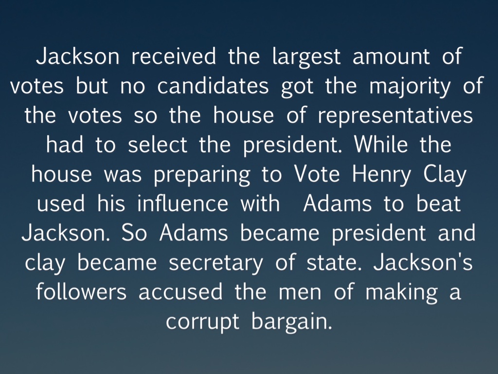 Jackson received the largest amount of votes but no candidates got the majority of the votes so the house of representatives had to select the president. While the house was preparing to Vote Henry Clay used his influence with Adams to beat Jackson. So Adams became president and clay became secretary of state. Jackson's followers accused the men of making a corrupt bargain.
