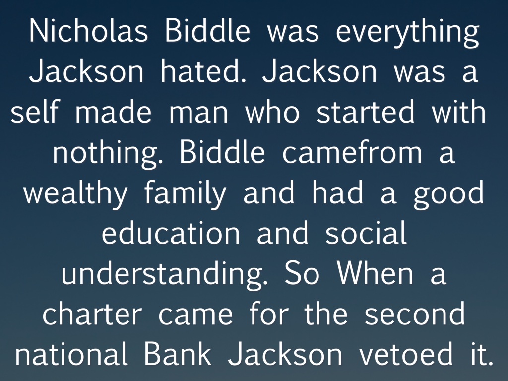 Nicholas Biddle was everything Jackson hated. Jackson was a self made man who started with nothing. Biddle camefrom a wealthy family and had a good education and social understanding. So When a charter came for the second national Bank Jackson vetoed it.