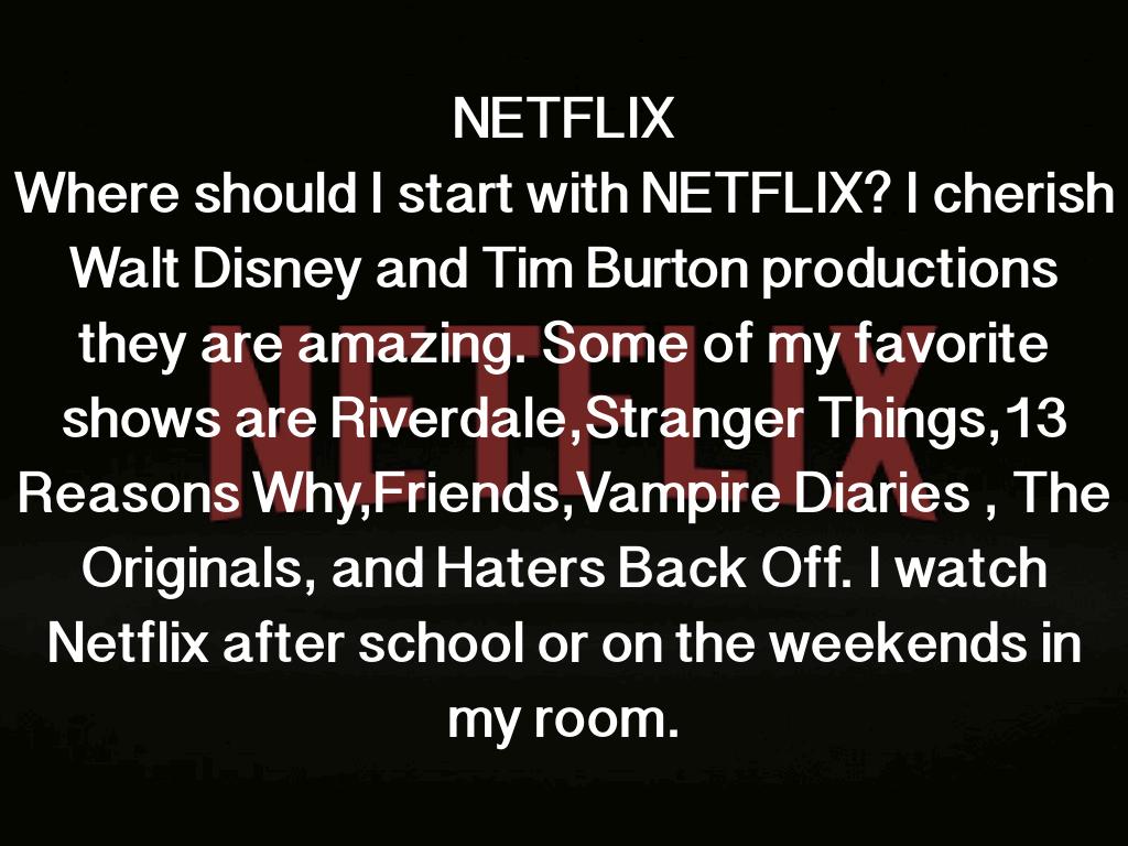 Where should I start with NETFLIX? I cherish Walt Disney and Tim Burton productions they are amazing. Some of my favorite shows are Riverdale,Stranger Things,13 Reasons Why,Friends,Vampire Diaries , The Originals, and Haters Back Off. I watch Netflix after school or on the weekends in my room.