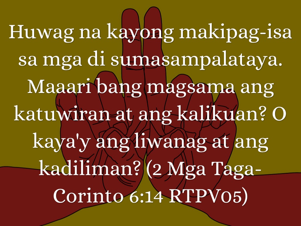 Huwag na kayong makipag-isa sa mga di sumasampalataya. Maaari bang magsama ang katuwiran at ang kalikuan? O kaya'y ang liwanag at ang kadiliman? (2 Mga Taga-Corinto 6:14 RTPV05)