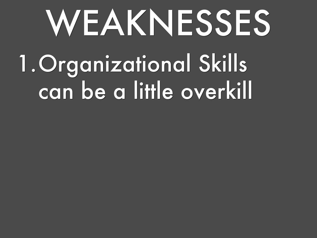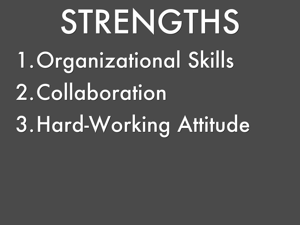 -My first strength would definitely relate to my organizational skills, I’m very good at keeping very efficient deadlines for myself and any others that could use the extra help.