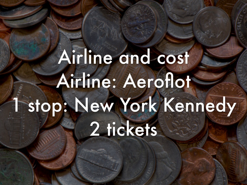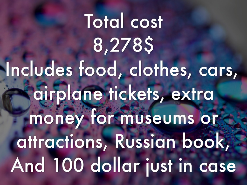 Includes food, clothes, cars, airplane tickets, extra money for museums or attractions, Russian book,