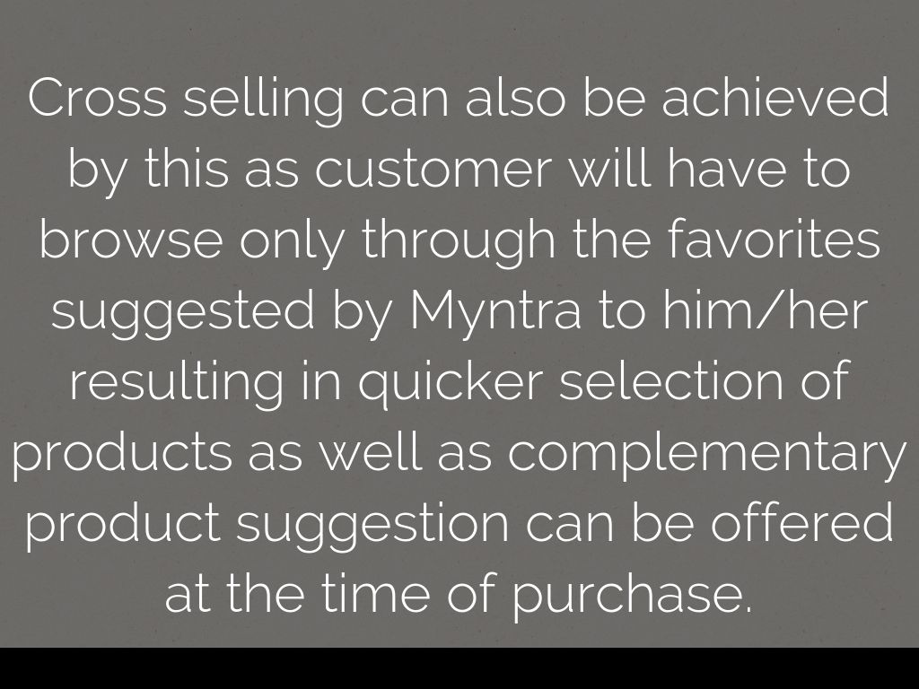 Cross selling can also be achieved by this as customer will have to browse only through the favorites suggested by Myntra to him/her resulting in quicker selection of products as well as complementary product suggestion can be offered at the time of purchase.