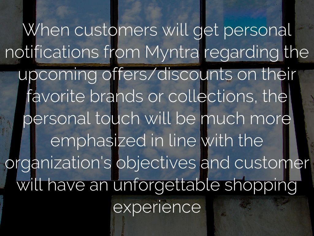 When customers will get personal notifications from Myntra regarding the upcoming offers/discounts on their favorite brands or collections, the personal touch will be much more emphasized in line with the organization's objectives and customer will have an unforgettable shopping experience