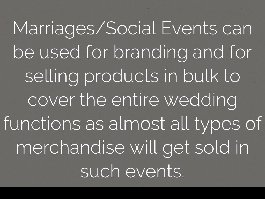 Marriages/Social Events can be used for branding and for selling products in bulk to cover the entire wedding functions as almost all types of merchandise will get sold in such events.