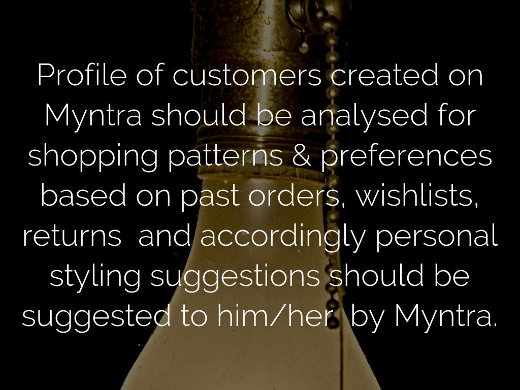 Profile of customers created on Myntra should be analysed for shopping patterns & preferences based on past orders, wishlists, returns and accordingly personal styling suggestions should be suggested to him/her by Myntra.