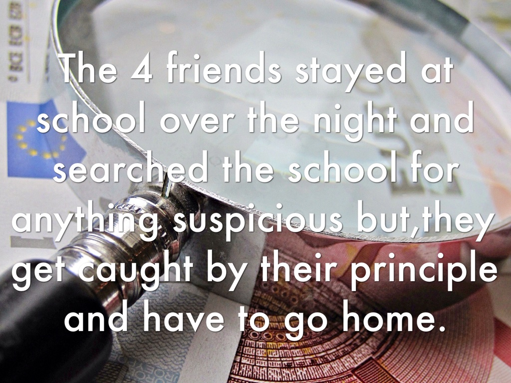 The 4 friends stayed at school over the night and searched the school for anything suspicious but,they get caught by their principle and have to go home.
