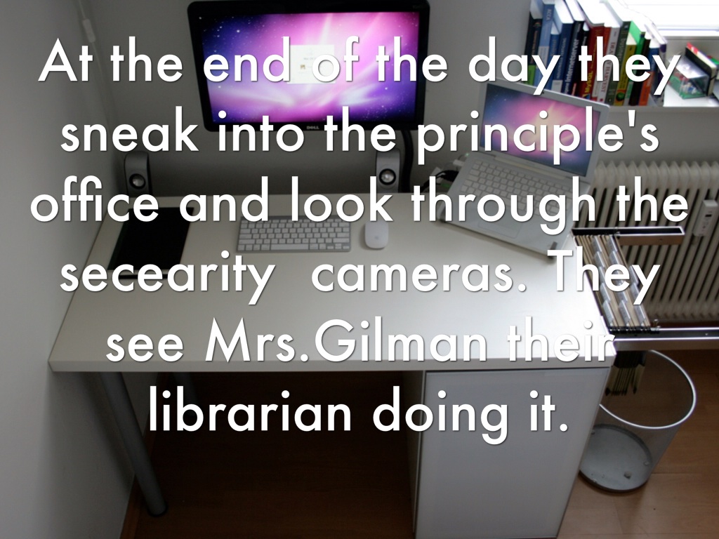 At the end of the day they sneak into the principle's office and look through the secearity cameras. They see Mrs.Gilman their librarian doing it.