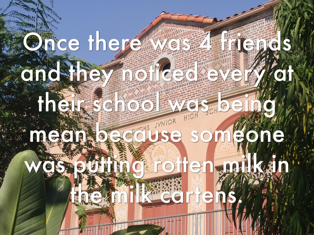 Once there was 4 friends and they noticed every at their school was being mean because someone was putting rotten milk in the milk cartens.