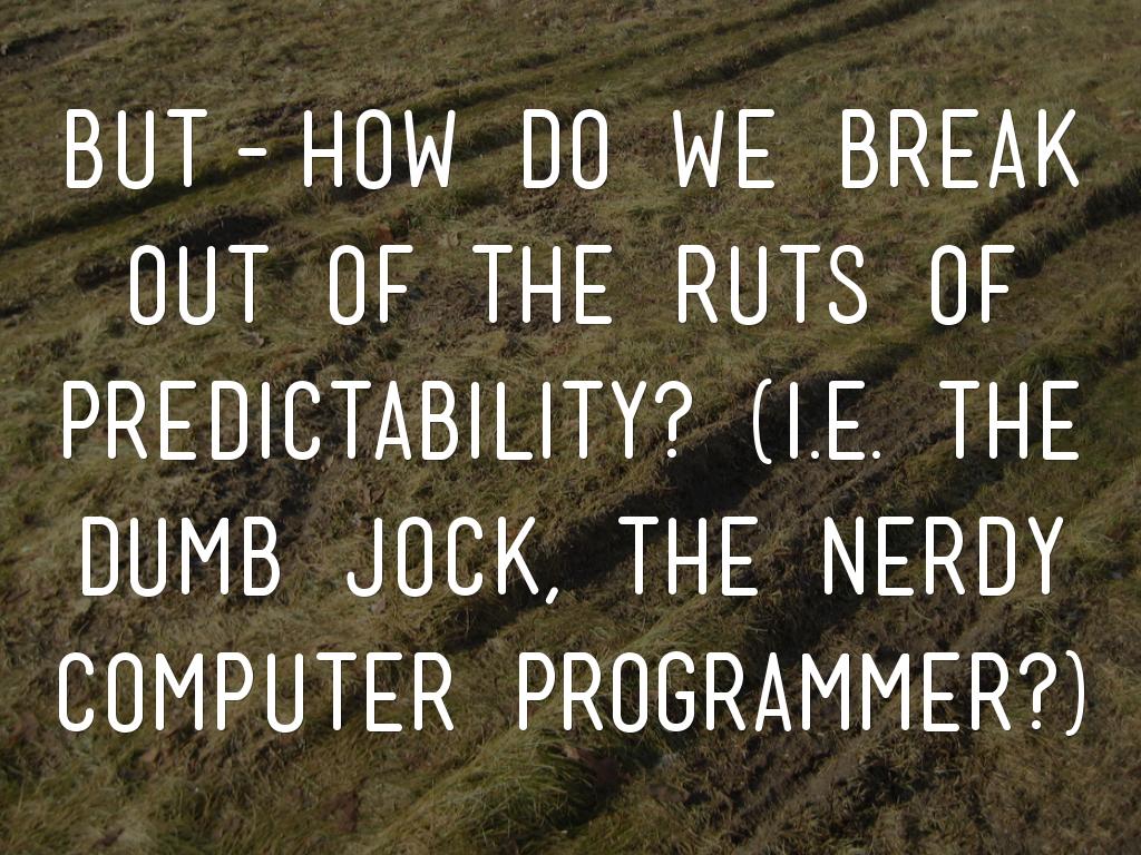 BUT-how do we break out of the ruts of predictability? (i.e. the dumb jock, the nerdy computer programmer?)