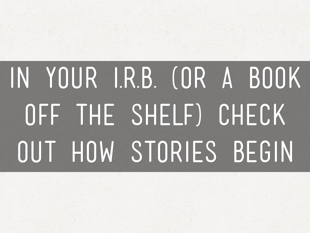 IN your I.R.B. (or a book off the shelf) check out how Stories begin