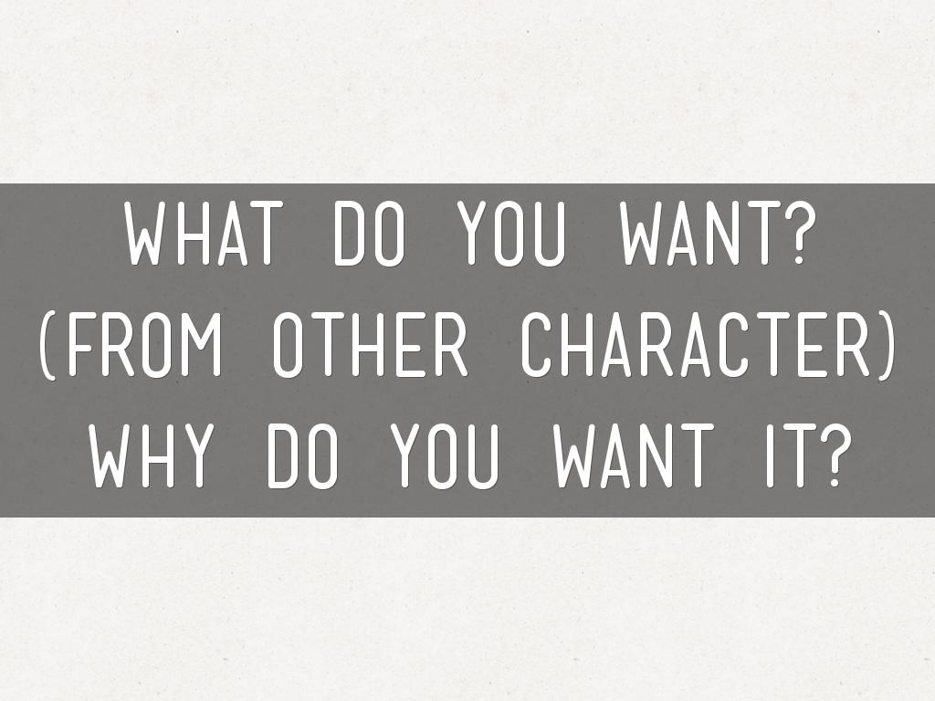 (i.e. Character a wants a date w/char. B; Character B wants to Borrow $100 from CHAR. A)