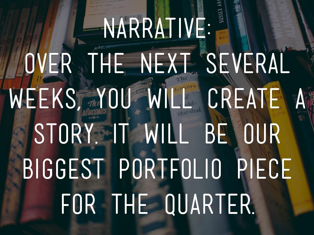 Over the next several weeks, you will create a story. It will be our biggest Portfolio piece for the quarter.