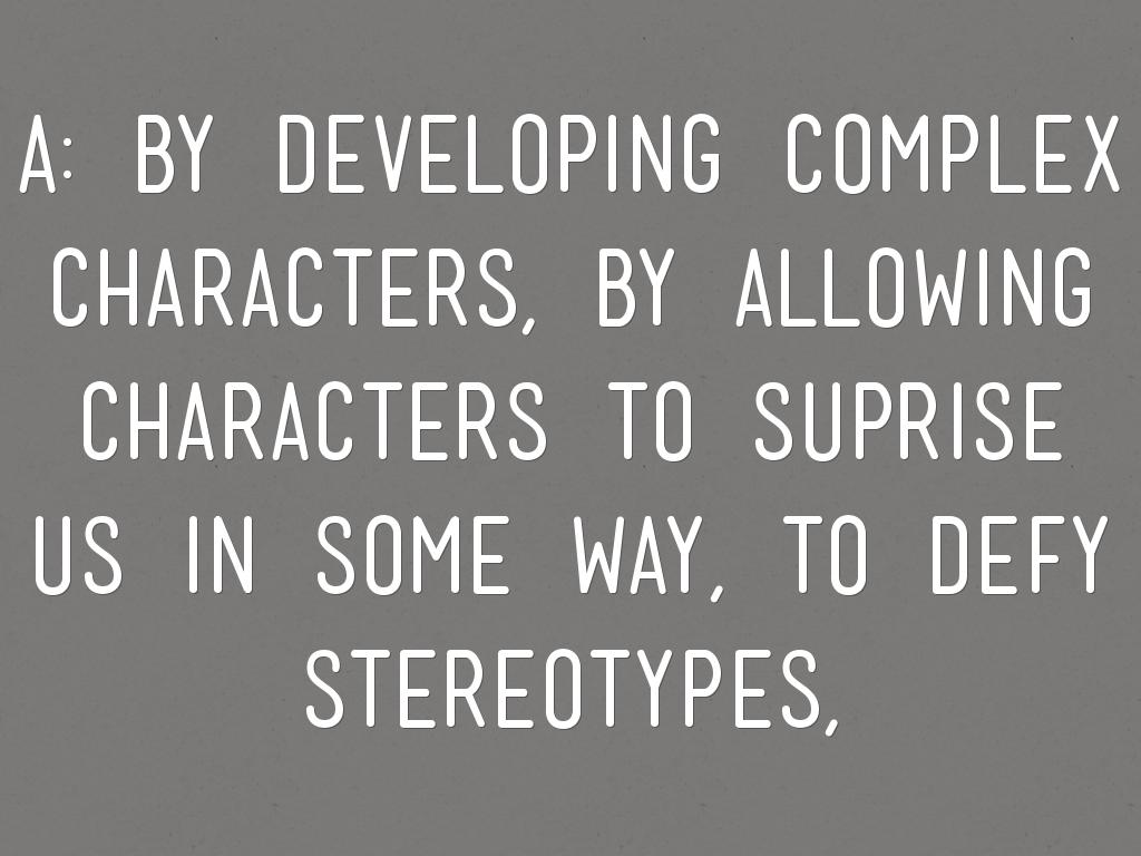 A: by developing complex characters, by allowing characters to suprise us in some way, to defy stereotypes,