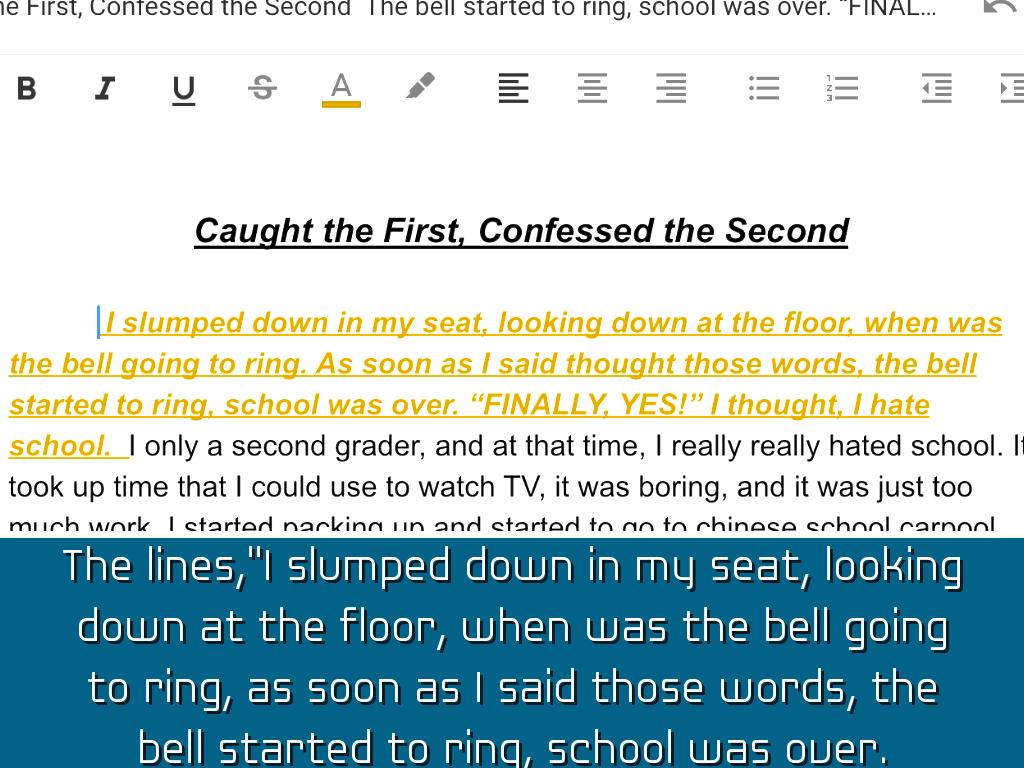 The lines,"I slumped down in my seat, looking down at the floor, when was the bell going to ring, as soon as I said those words, the bell started to ring, school was over. "FINALLY. YES!" I thought, I hate school.