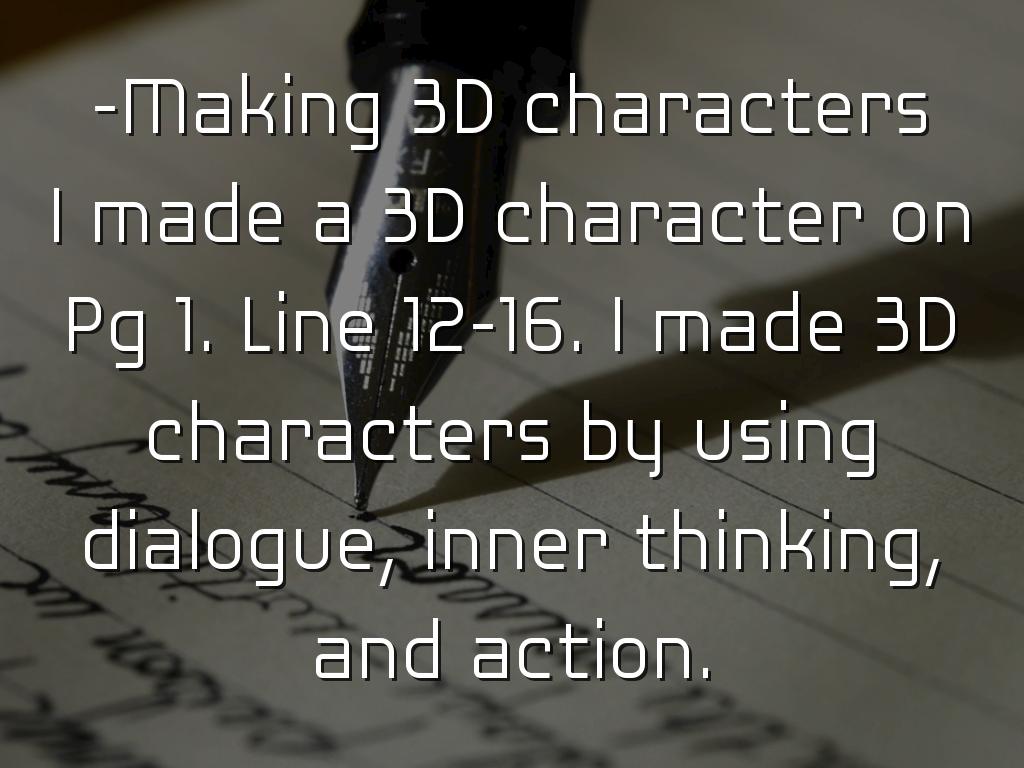 I made a 3D character on Pg 1. Line 12-16. I made 3D characters by using dialogue, inner thinking, and action.