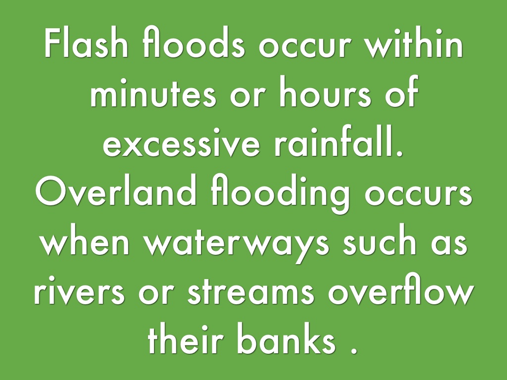 Two types of floods are flash floods and overland flooding .