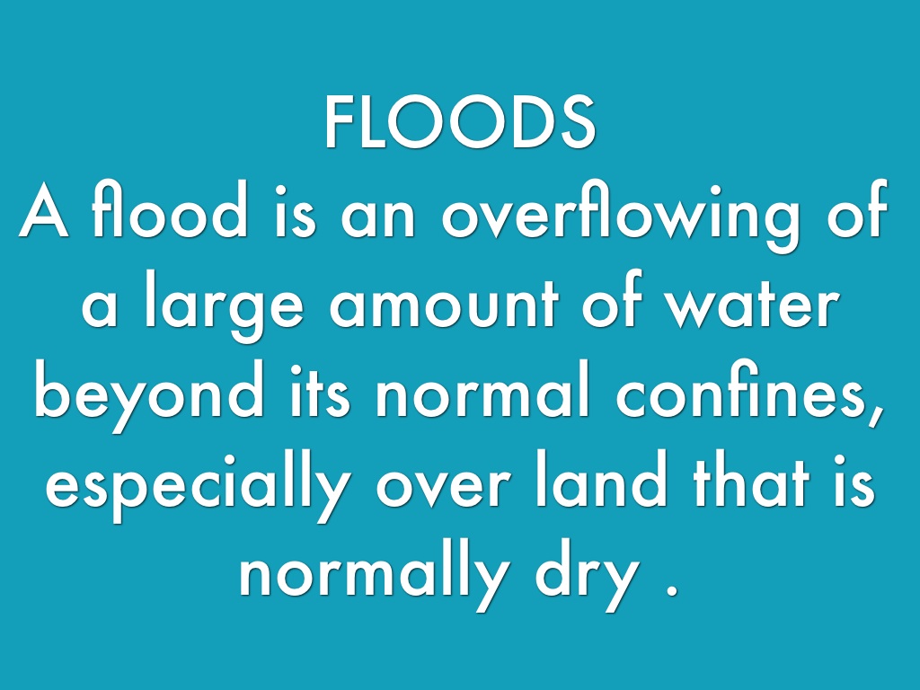 A flood is an overflowing of a large amount of water beyond its normal confines, especially over land that is normally dry .
