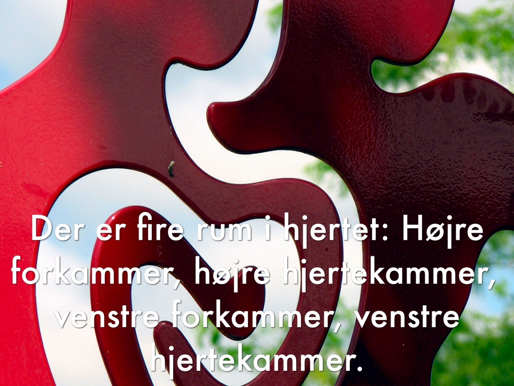 Der er fire rum i hjertet: Højre forkammer, højre hjertekammer, venstre forkammer, venstre hjertekammer.