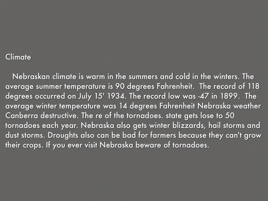 Nebraskan climate is warm in the summers and cold in the winters. The average summer temperature is 90 degrees Fahrenheit. The record of 118 degrees occurred on July 15' 1934. The record low was -47 in 1899. The average winter temperature was 14 degrees Fahrenheit Nebraska weather Canberra destructive. The re of the tornadoes. state gets lose to 50 tornadoes each year. Nebraska also gets winter blizzards, hail storms and dust storms. Droughts also can be bad for farmers because they can't grow their crops. If you ever visit Nebraska beware of tornadoes.