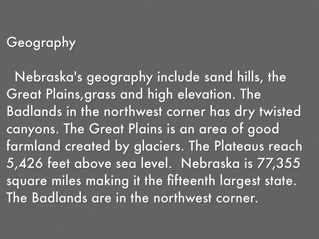 Nebraska's geography include sand hills, the Great Plains,grass and high elevation. The Badlands in the northwest corner has dry twisted canyons. The Great Plains is an area of good farmland created by glaciers. The Plateaus reach 5,426 feet above sea level. Nebraska is 77,355 square miles making it the fifteenth largest state. The Badlands are in the northwest corner.