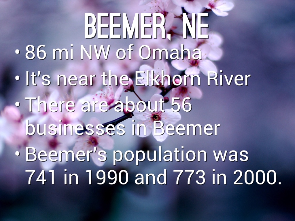 • Beemer's population was 741 in 1990 and 773 in 2000.