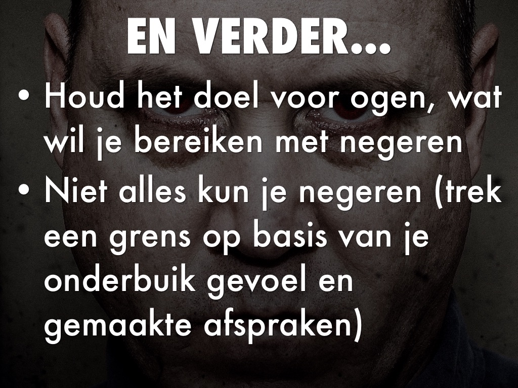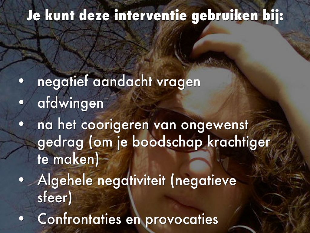 Soms is het nodig dat je die gingen opmerkt die jou en anderen schade kunnen berokkenen en vervolgens tot handelen overgaat. En dat handelen betekent niet dat je de confrontatie hoeft op te zoeken, dat je er iets mee moet. Actie vraagt om reactie en vaak denkt men dat het zwak is om bij provocatie niets te doen maar uit mijn werk met de meest heftige zorgvragers dat ons land rijk is kan ik je vertellen dat het negeren van een provocatie getuigt van kracht want het stoelt op een diep vertrouwen in jezelf. Negeren is iets heel anders dan 'niets doen' het is een actie vandaar dat ik het opgenomen heb in mijn lijst van de meest effectieve de-escalerende interventies.